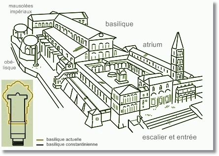 ![]() | cliquez vers une restitution de l'ancienne basilique Saint-Pierre telle qu'elle apparaissait à l'époque carolingienne; l'encart en bas à gauche montre une comparaison entre la basilique contemporaine et l'ancienne basilique (la place Saint-Pierre n'est pas représentée; la basilique baroque est également centrée sur la tombe de saint Pierre) |